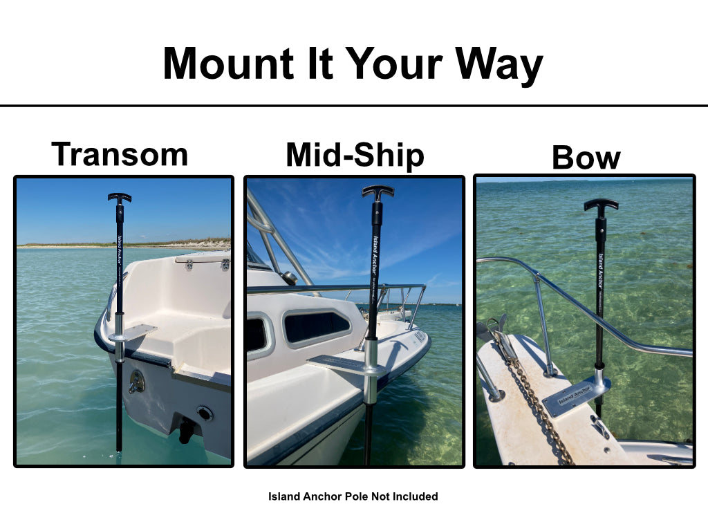 The Island Anchor Shallow Water Anchor Pole Mount securely holds your pole for quick and easy anchoring. ID 1-1/8". Accepts 3/4" and 1" poles including poles with 2-piece couplers. Made from 3/8" thick anodized aluminum for strength and corrosion resistance. Proudly Made in the USA by Salty Adventures.